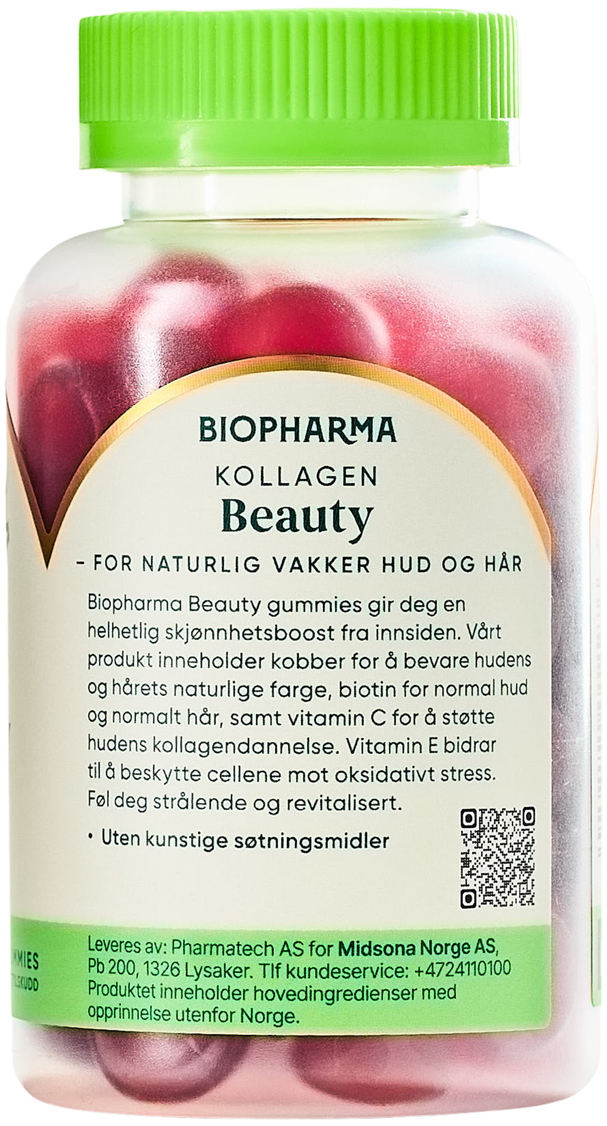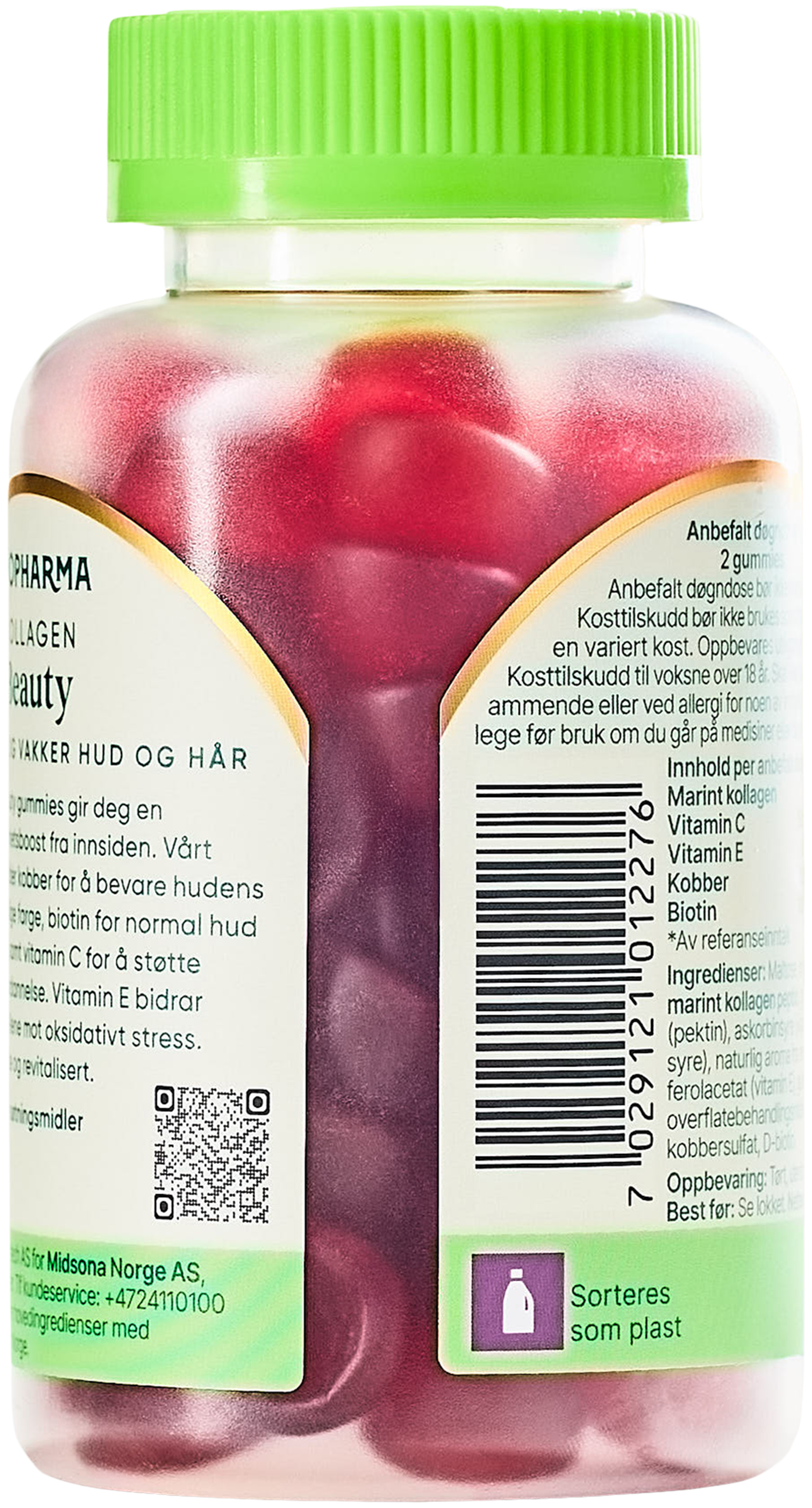 Maltose, hvitt granulert sukker, MARINT KOLLAGEN PEPTID(fisk), geleringsmiddel (pektin), askorbinsyre (vitamin C), syre (sitronsyre), naturlig aroma fra fersken, DL-alfa-tokoferolacetat (vitamin E), gulrotjuicekonsentrat, overflatebehandlingsmiddel (karnaubavoks), kobbesulfat, D-biotin.