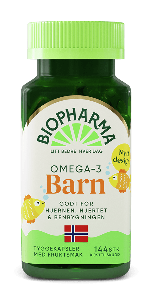 Biopharma Trippel Omega-3 tyggekapsler for barn er viktig for vekst og utvikling av barns bein. Biopharma Trippel Omega-3 Barn inneholder fiskeolje i sin naturlige form med hovedvekt på DHA-fettsyren. I tillegg til omega-3 inneholder produktet vitamin D, E og K2. Vitamin D er nødvendig for at barns bein skal vokse og utvikles normalt. Tyggekapslene har en deilig smak av frukt.
